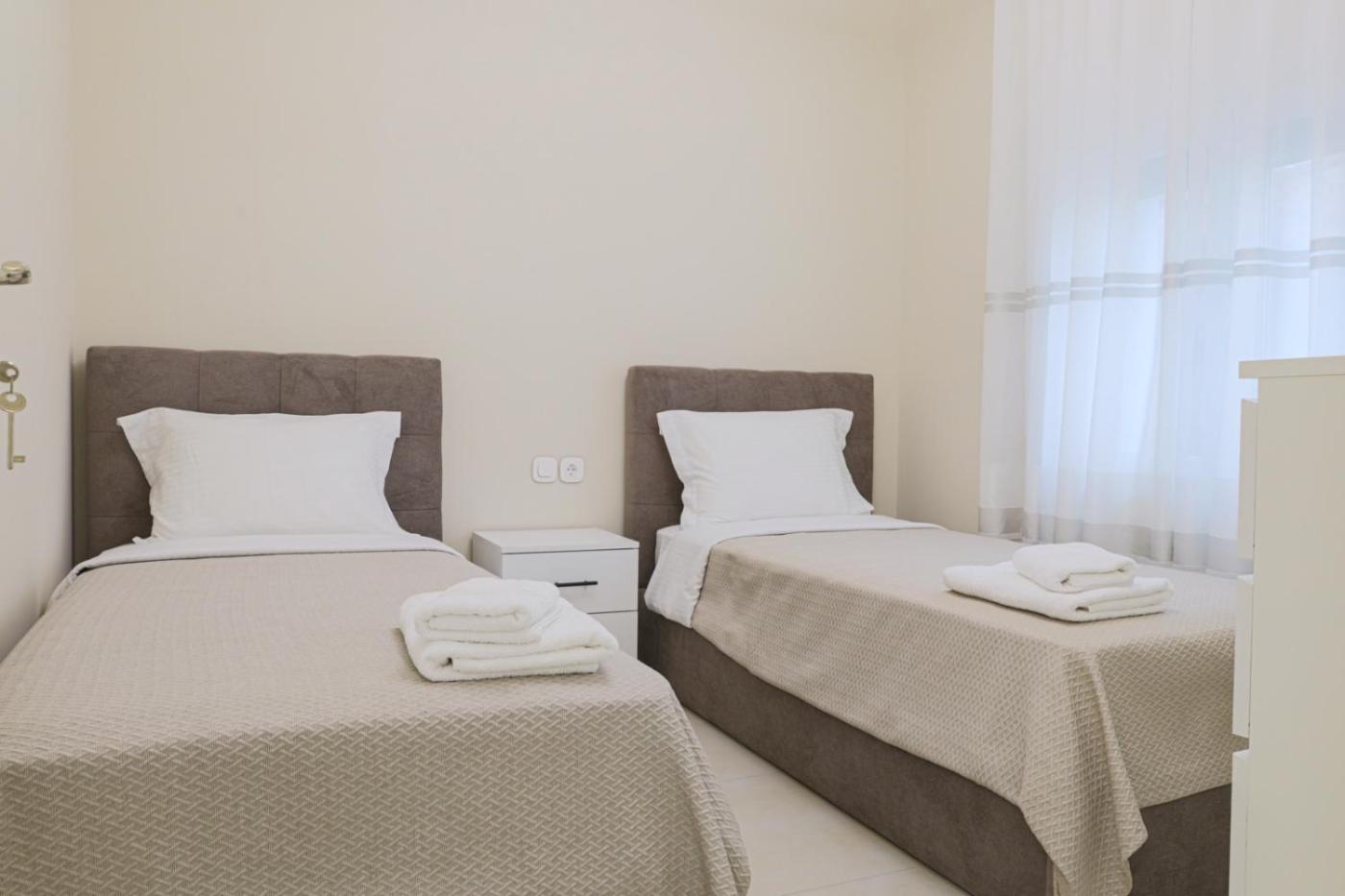 Two-Bedroom House. This air-conditioned holiday home comprises 1 living room, 2 separate bedrooms and 1 bathroom with a shower. Guests can make meals in the kitchen that is equipped with a stovetop, a refrigerator, kitchenware and an oven. Featuring a balcony, this holiday home also provides a washing machine, a tea and coffee maker and a flat-screen TV. The unit offers 4 beds. ;